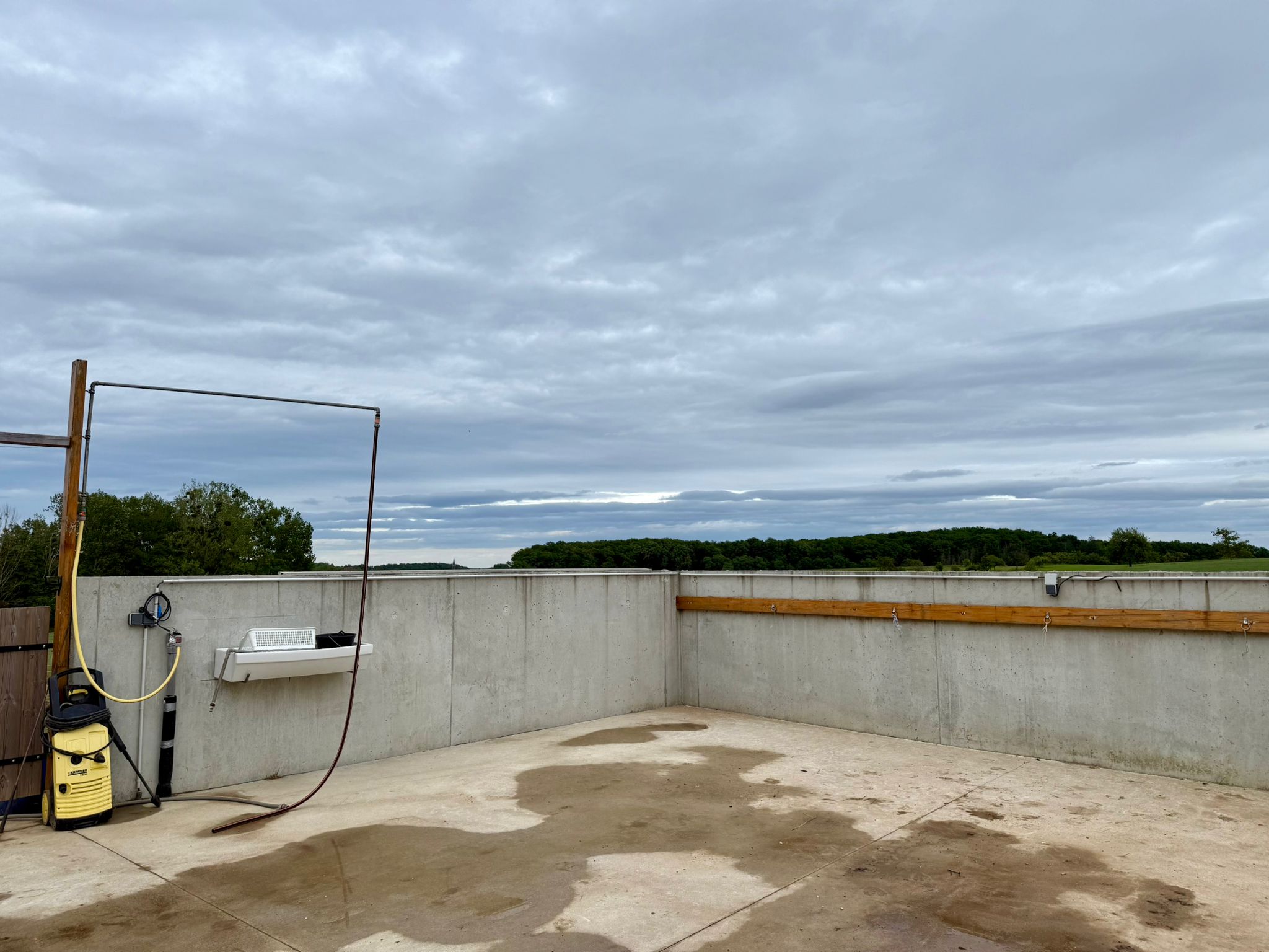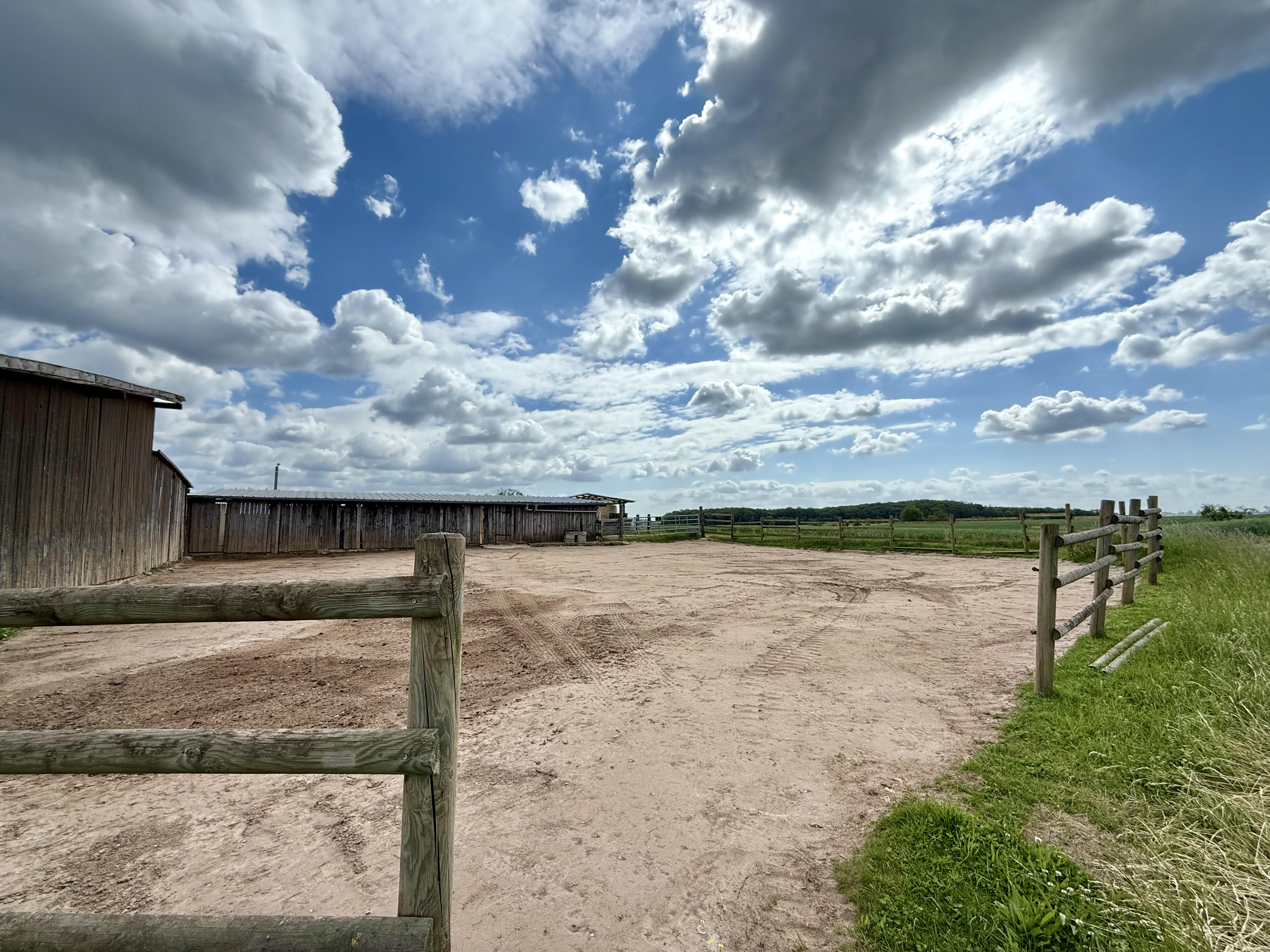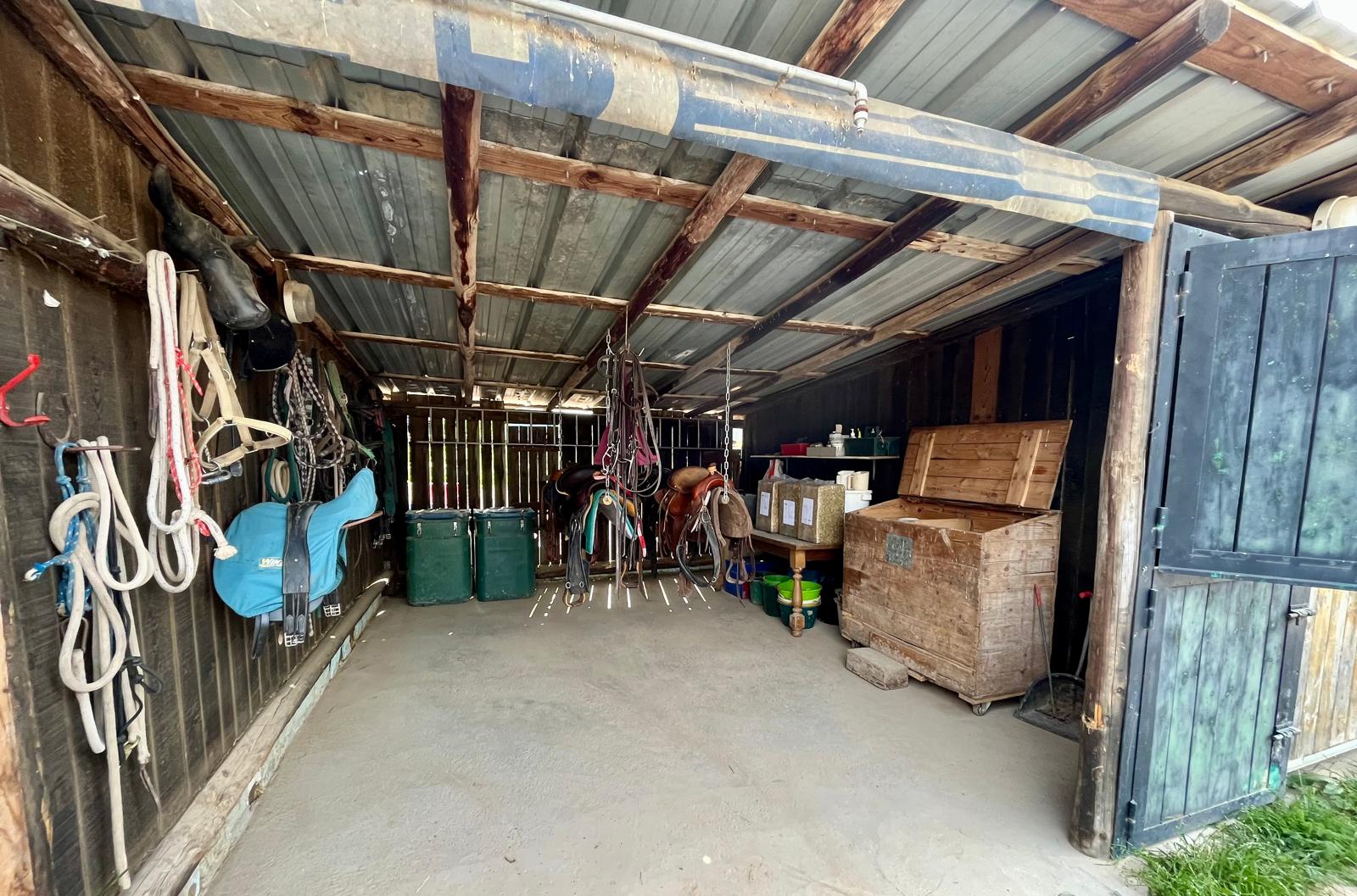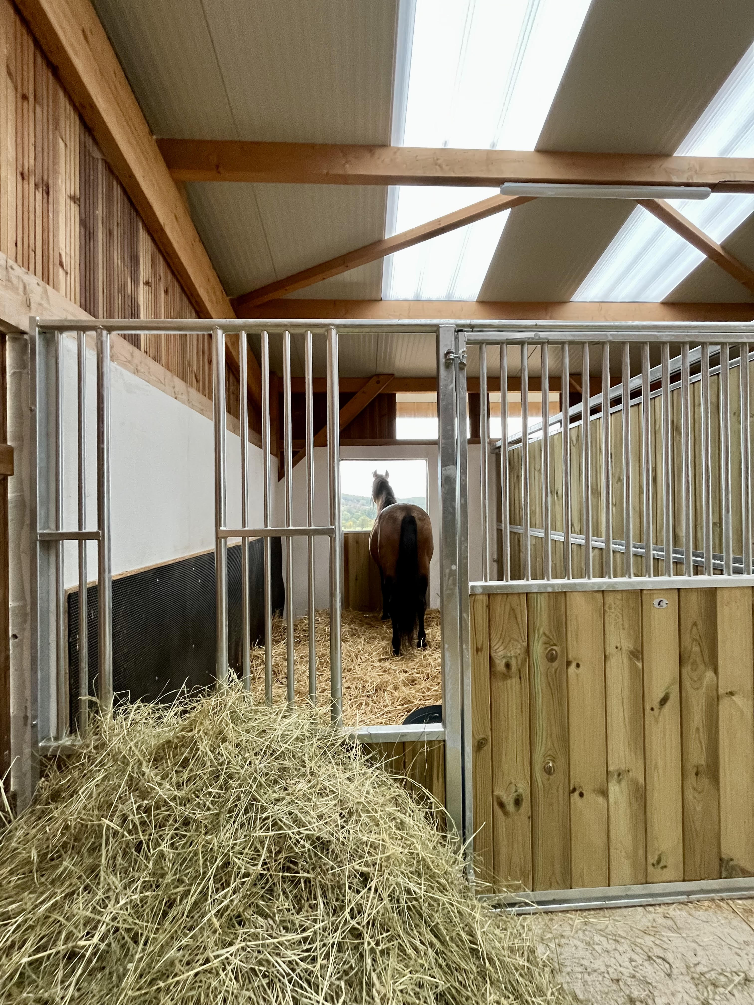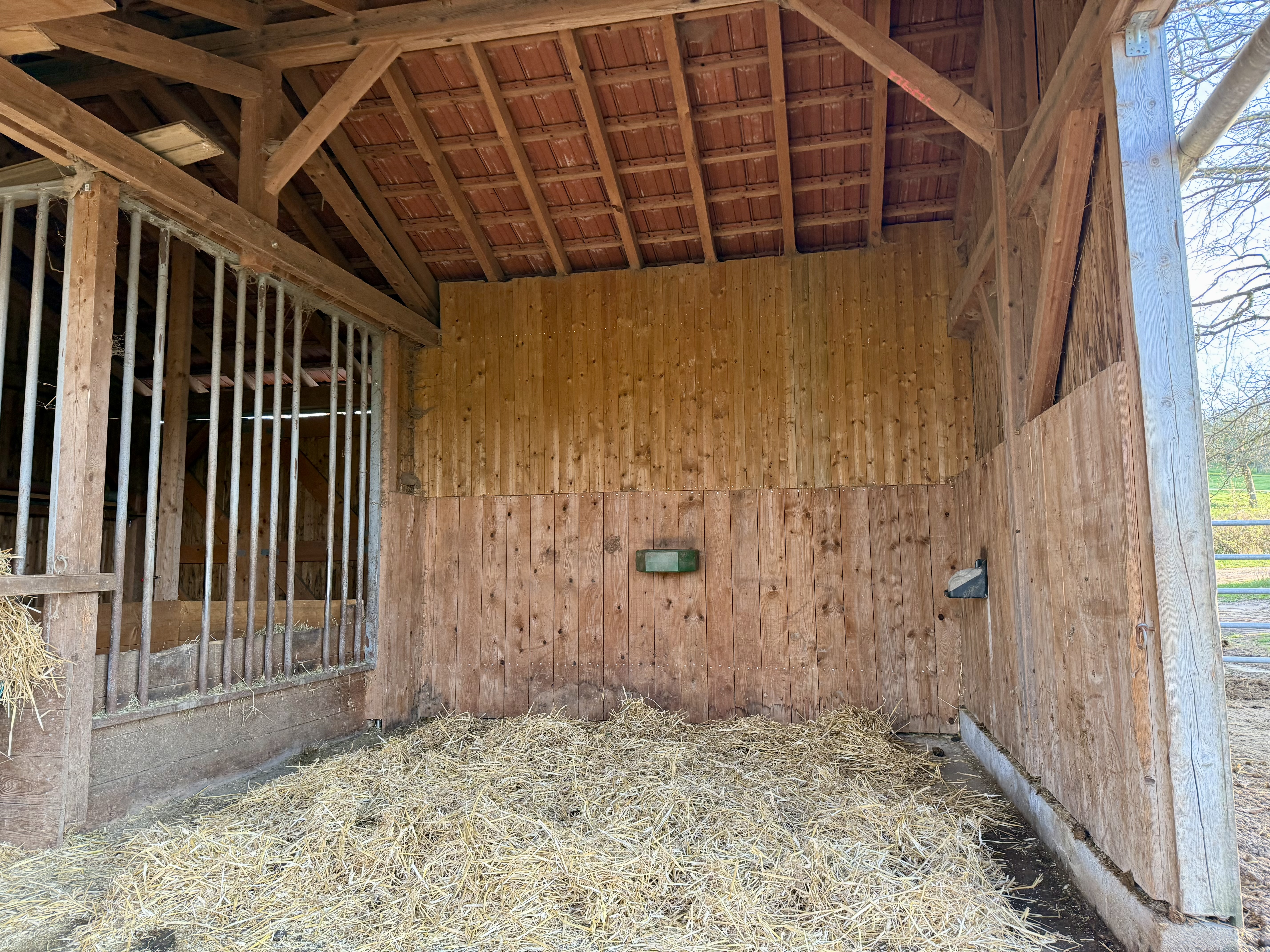 Un abri complet accessible directement depuis un parc, équipé d’une litière, d’une mangeoire, d’un espace de rangement et de stockage au sec, idéal pour les chevaux en liberté tout en gardant du confort.